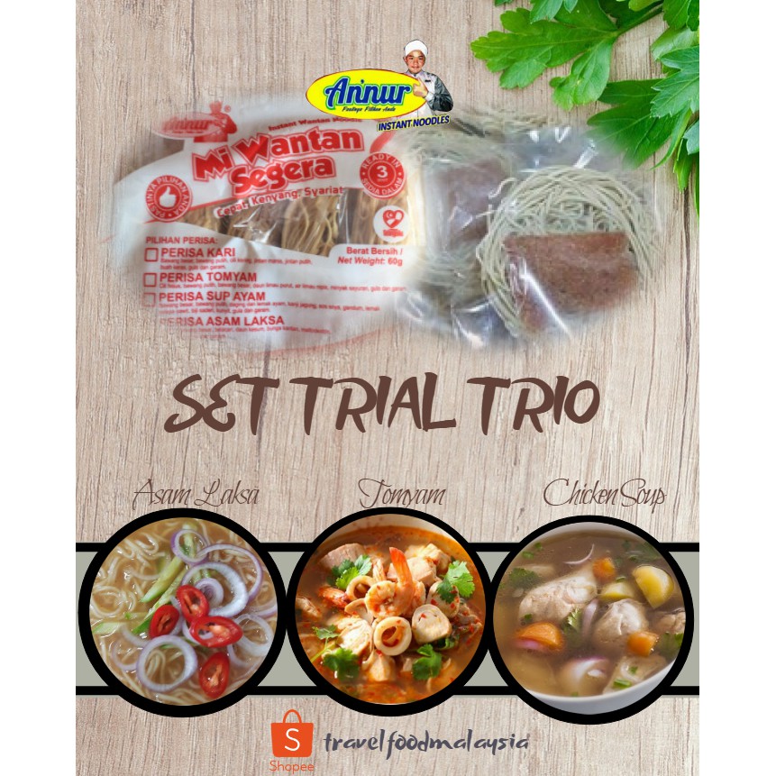 Annur Set Trial Trio 3 Paket Mi Wantan Halal Tomyam Asam Laksa Sup Ayam Halal Tanpa Wax Tanpa Msg